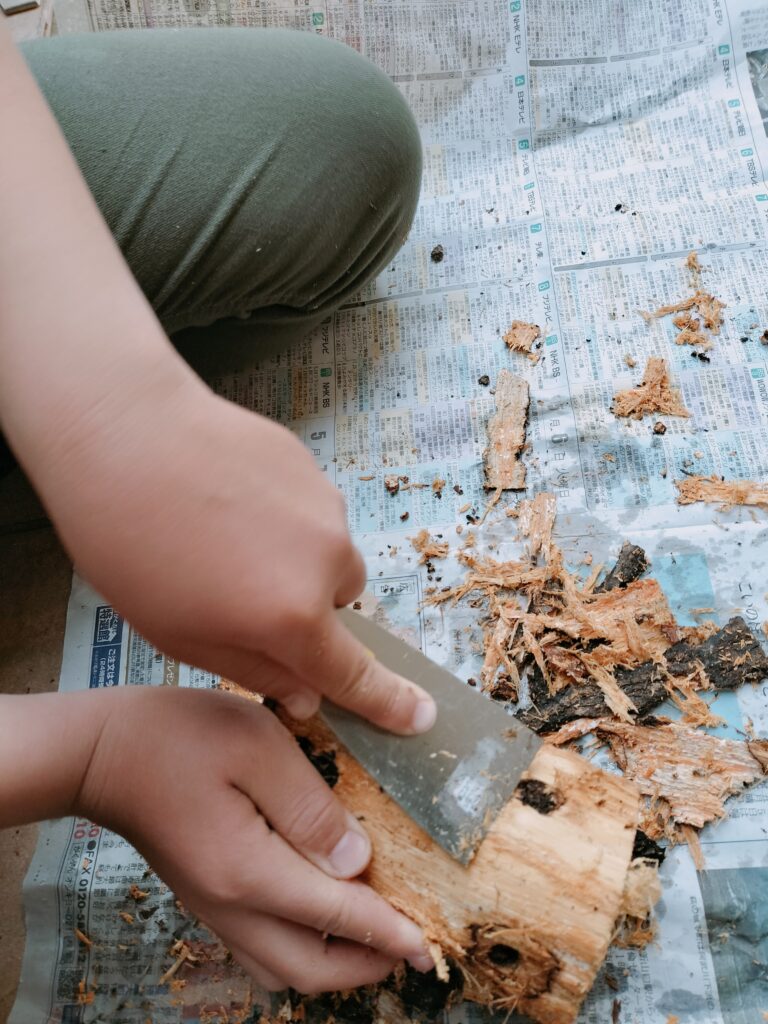 30分以上浸したあと、樹皮をヘラでむいていきます。